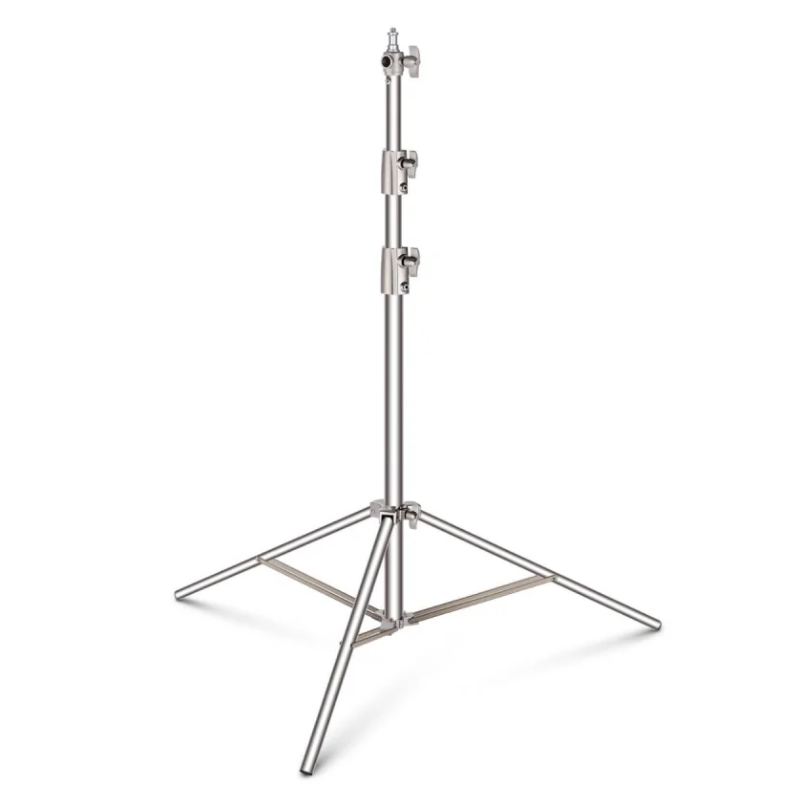 Soporte de iluminación robusto construido en acero, diseñado para brindar máxima estabilidad en equipos pesados. Ideal para luces, modificadores o accesorios grandes. Su altura ajustable y sistema de bloqueo reforzado garantizan seguridad y durabilidad incluso en sesiones intensas.