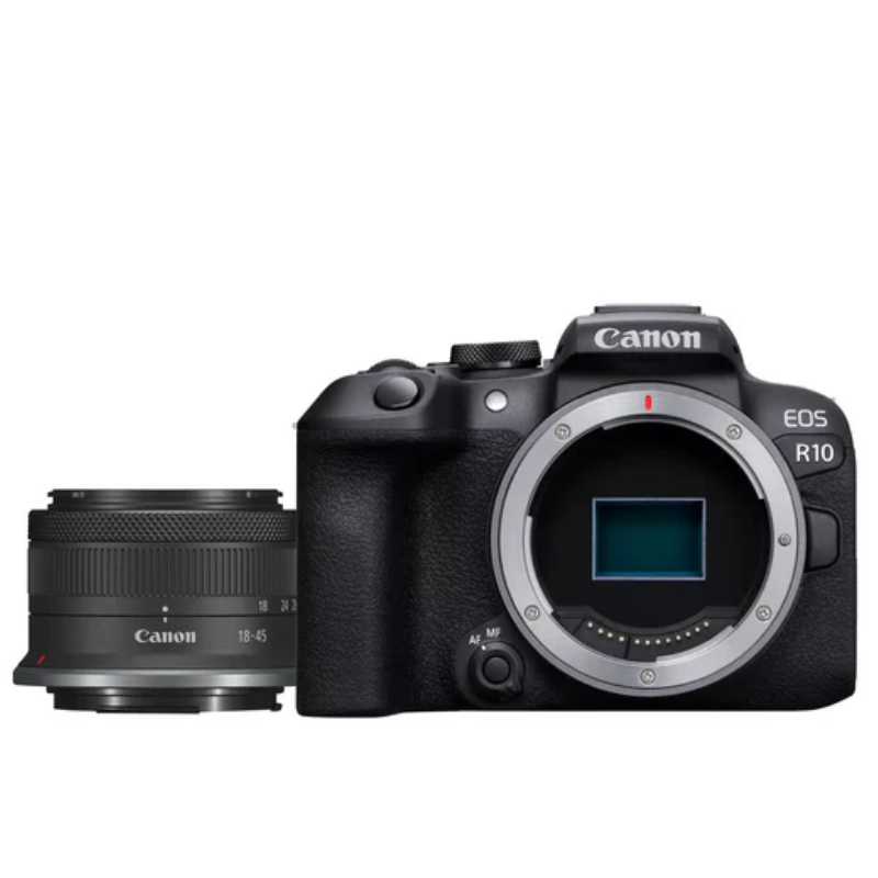 La Canon EOS R10 en kit con el objetivo RF-S 18-45 mm f/4.5-6.3 IS STM es una cámara sin espejo con sensor APS-C de 24,2 megapíxeles y montura RF, diseñada para creadores que buscan versatilidad tanto en fotografía como en vídeo. Combina un rendimiento ágil, enfoque automático avanzado, y conectividad moderna en un cuerpo compacto y ligero.