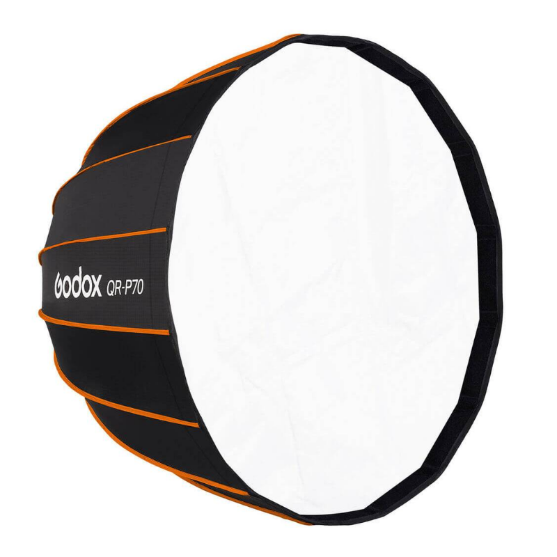 El Parabólico Godox QR-P70 de 70 cm ofrece una iluminación potente, suave y direccional, ideal para retratos, moda y grabaciones en estudio. Su diseño parabólico profundo proporciona un mayor control sobre la dirección y la difusión de la luz, logrando un efecto más concentrado y con transiciones suaves de sombras. Gracias a su sistema de apertura rápida tipo paraguas, se arma y desmonta fácilmente, siendo práctico para sesiones tanto en estudio como en exteriores. Su interior plateado reflectante maximiza la eficiencia lumínica y su montura Bowens lo hace compatible con una amplia gama de luces y flashes profesionales.