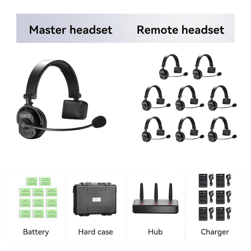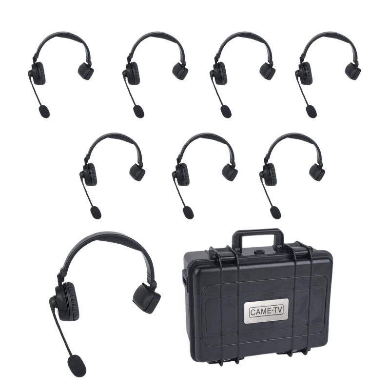 El sistema incluye una unidad central (base) que gestiona y coordina la comunicación entre todos los audífonos, asegurando una conexión estable y organizada. Su diseño tipo diadema es cómodo para uso prolongado y el kit se entrega con maletín para transporte seguro.