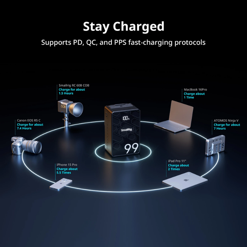 La SmallRig VB99 SE es una batería profesional con montura V-Mount diseñada para alimentar cámaras, luces LED, monitores y accesorios de producción audiovisual. Pertenece a la línea compacta de baterías de SmallRig, ofreciendo una capacidad de 99 Wh en un formato relativamente pequeño y ligero. Incorpora múltiples puertos de salida, lo que permite alimentar varios dispositivos al mismo tiempo, además de un sistema inteligente de gestión de energía que protege la batería contra sobrecargas, sobrecalentamiento y cortocircuitos. Es una solución práctica para producciones de video, fotografía y setups móviles que requieren energía confiable y versátil.