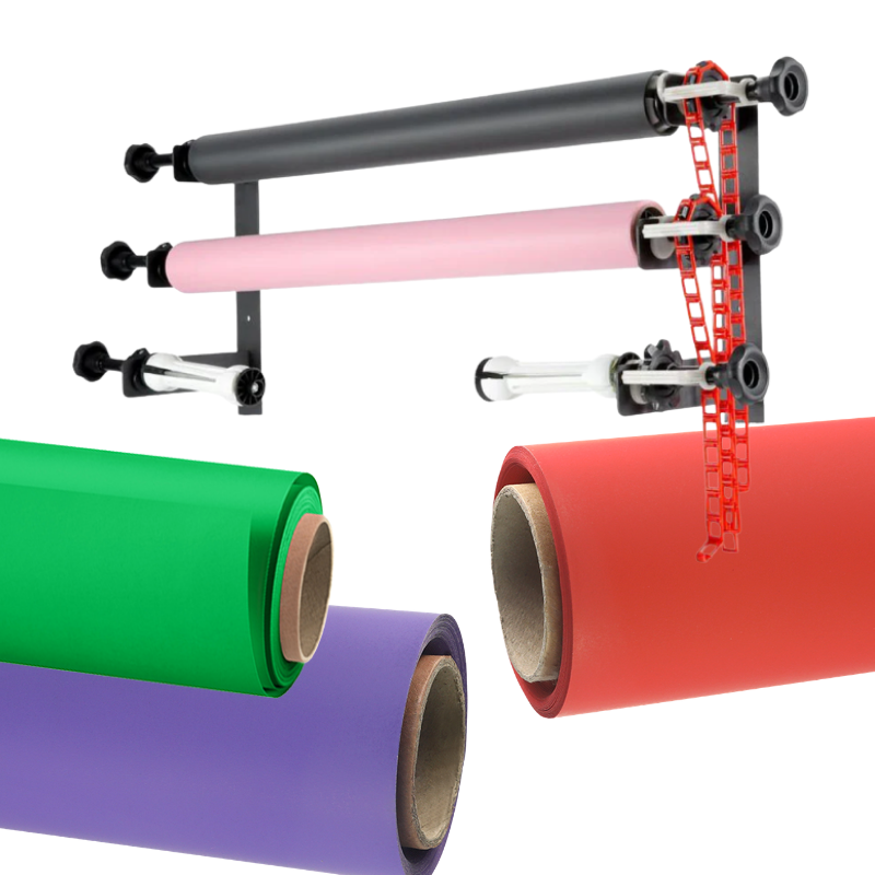 Sistema de portafondos empotrable ideal para estudios fotográficos y de video que buscan una solución práctica, ordenada y profesional para manejar múltiples fondos. Este kit permite montar hasta 3 rollos de fondo en pared o techo, optimizando el espacio de trabajo y facilitando cambios rápidos entre colores o estilos. Incluye además 3 fondos de cartulina de alta calidad, perfectos para fotografía de retrato, producto o contenido audiovisual.