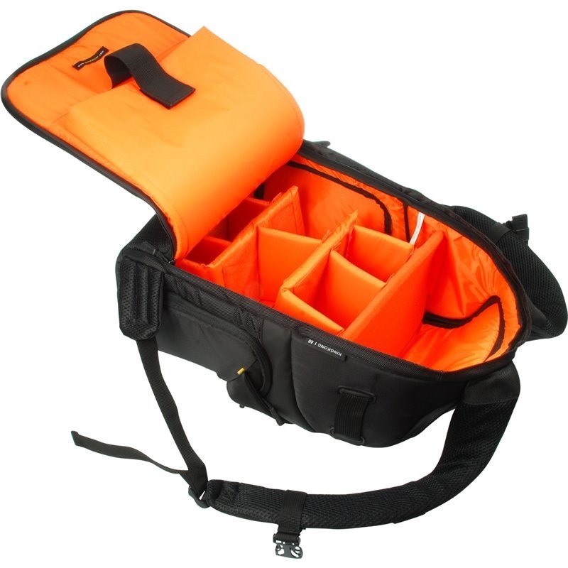 El interior de la Bolsa Fancier Kingkong II 40 es espacioso y acolchado. Tiene diferentes compartimentos ajustables gracias a los separadores extraíbles. La Bolsa Fancier Kingkong II 40 tiene en el interior unos pequeños bolsillos para guardar las tarjetas de memoria, un bolsillo frontal y dos aperturas laterales que facilitan el acceso al material.